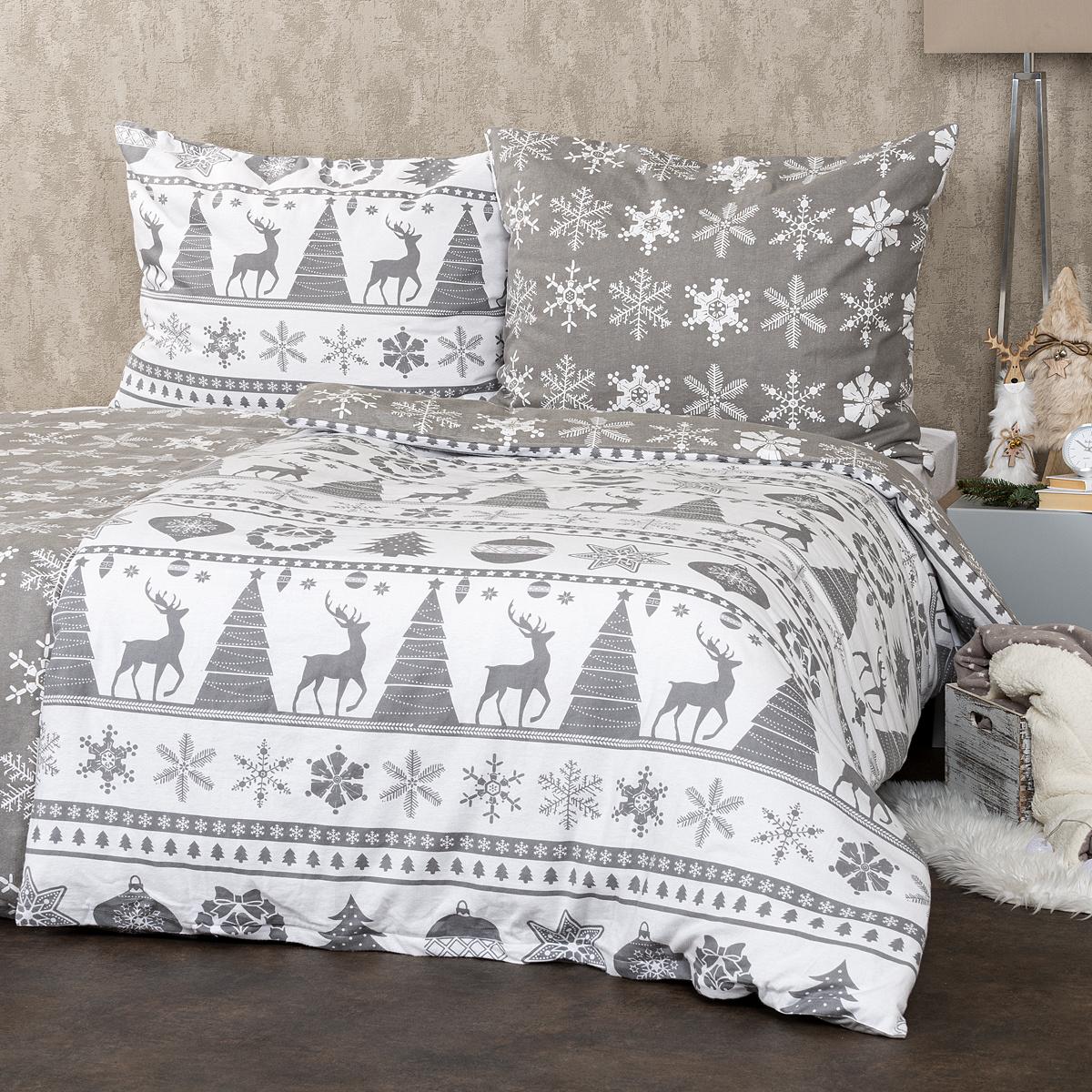 Spríjemnite si nielen mrazivé noci hebučkými obliečkami, ktoré doslova pozývajú k zababušeniu! Štýlové flanelové obliečky s kúzelnými vianočnými motívmi v decentnej kombinácii sivej a bielej vám zaručene prinesú tú správnu domácu pohodu. Jemný bavlnený flanel je vďaka typickému počesaniu krásne mäkký a hrejivý, obliečky sú teda ideálne pre chladné jesenné a zimné noci.Obliečky sú obojstranné – z jednej strany vianočný vzor s jeleňmi, stromčekmi a ozdôbkami, z druhej strany motív vločiek v rôznych tvaroch – môžete ich teda ľubovoľne kombinovať a meniť svoju posteľ každý deň. Pre maximálne pohodlie majú obliečky praktické zapínanie na zips. Súprava obsahuje: 1x obliečka na vankúš 70 x 90 cm 1x obliečka na prikrývku 140 x 220 cm
