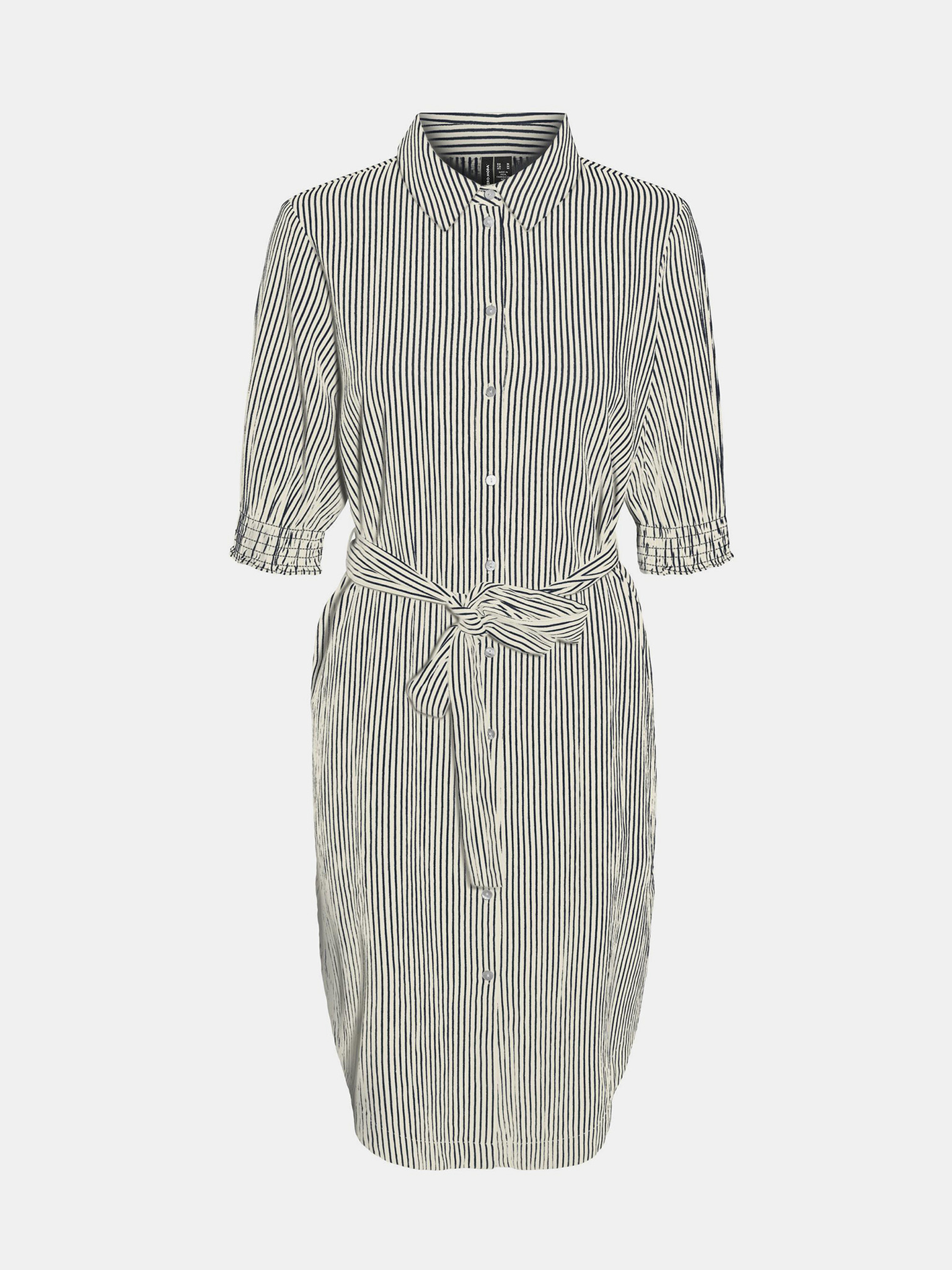 Model: Annabelle Farba: krémová, tmavomodrá Vzor: pruhovaný Strih: rovný, košeľový Dĺžka: ku kolenám Zapínanie: na gombíky Udržiteľnosť: organická bavlna Materiál: 100 % organická bavlna