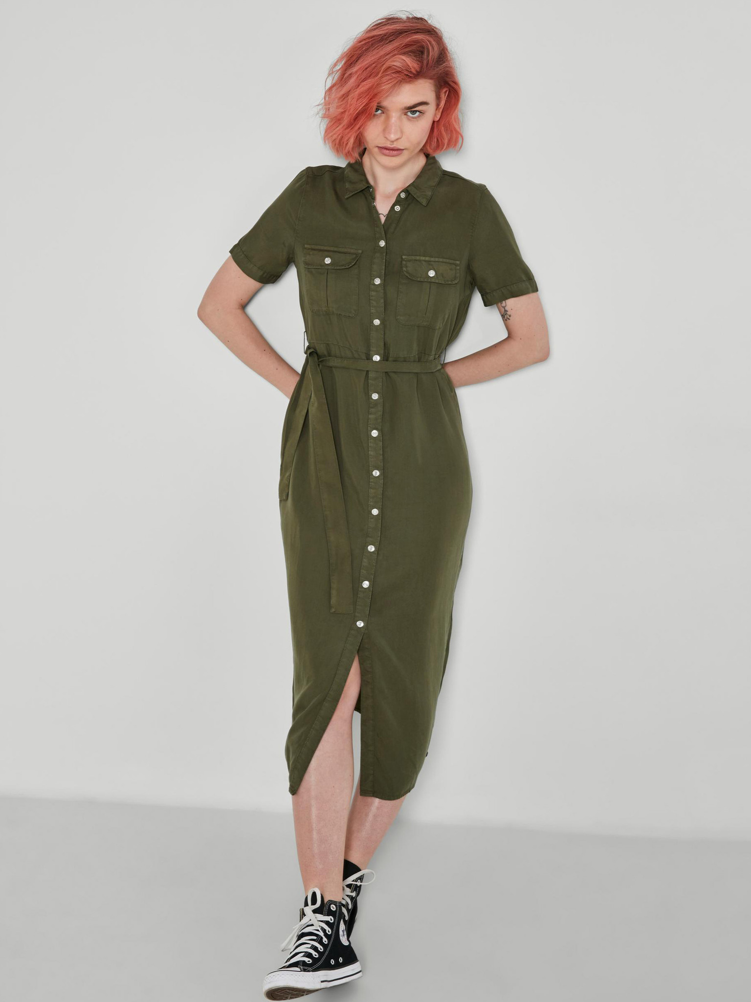 Model: Cersei Farba: kaki Strih: košeľový, áčkový Dĺžka: dlhá Zapínanie: na gombíky Materiál: 100% TENCEL™ Lyocell Udržiteľnosť: vyrobené z ekologických prírodných vlákien spoločnosti TENCEL™ (výroba šetrná k životnému prostrediu)