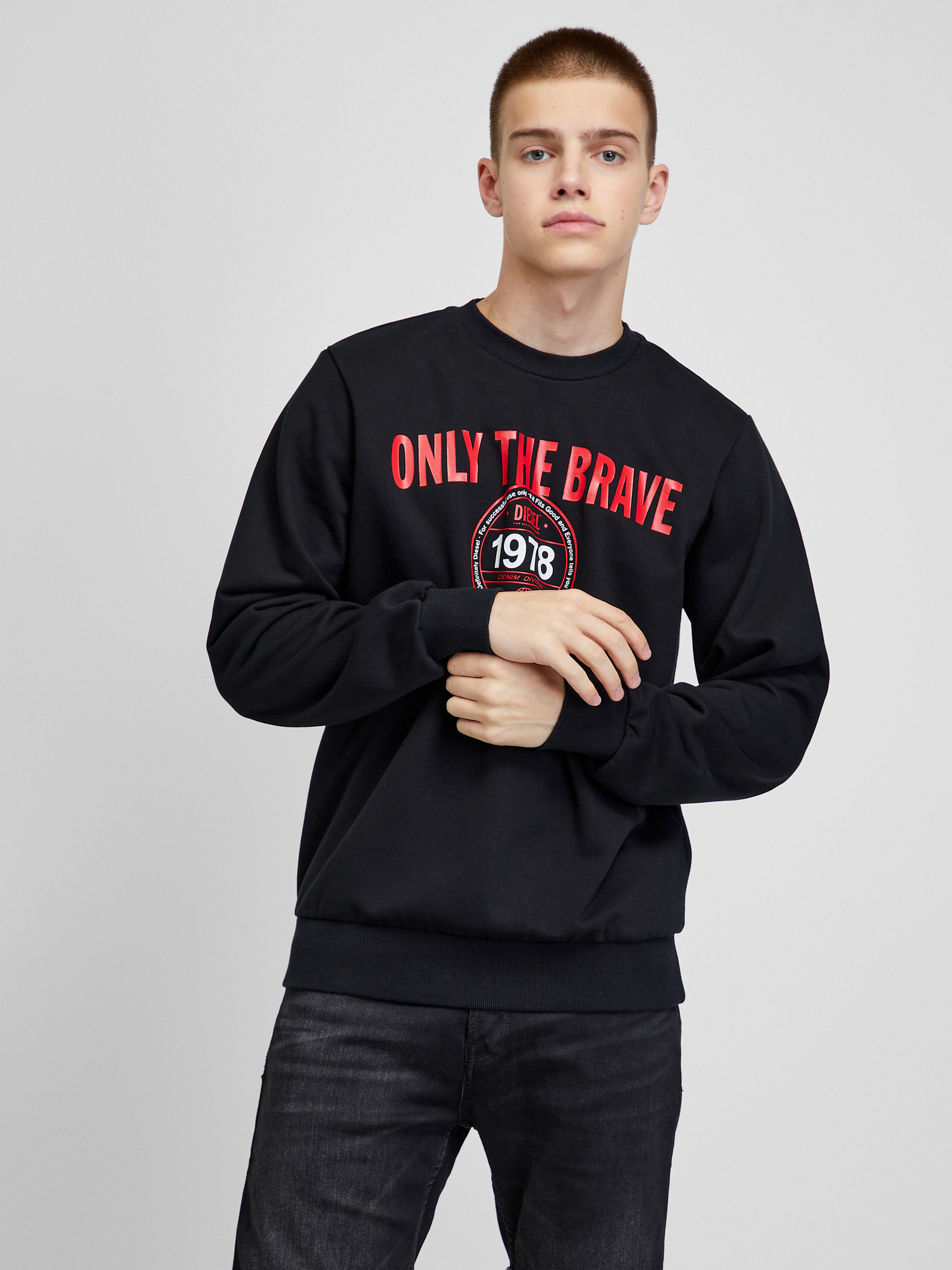Model: Girk Farba: čierna Vzor: predný diel – s potlačou regular fit Rukáv: dlhý Materiál: hlavná časť – 60% bavlna, 40% polyester; lem – 95% bavlna, 5% elastan Model meria: 185 cm Model má na sebe veľkosť: L
