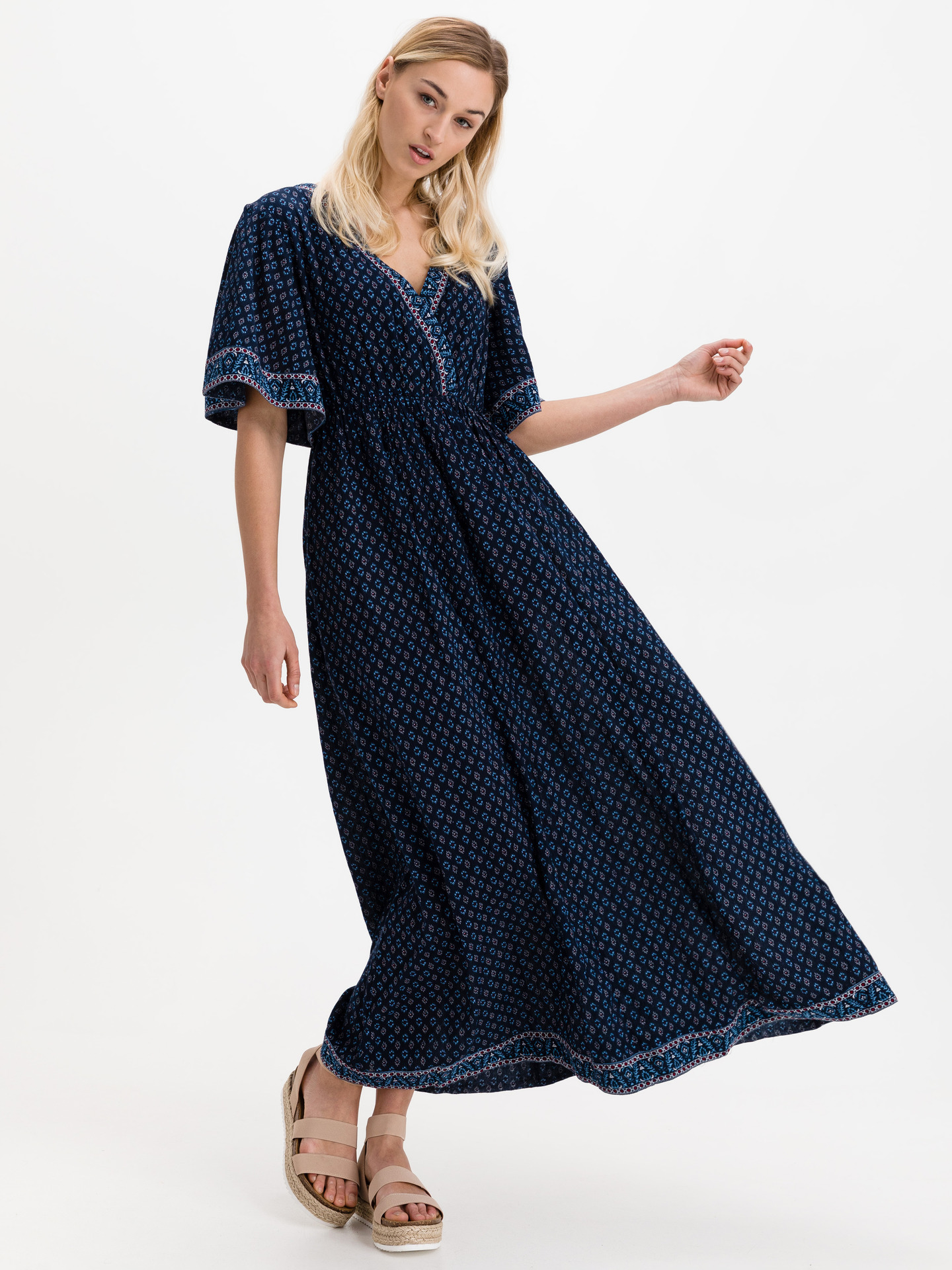 Materiál: 100 % bavlna Strih: maxi Typ: voľnočasové Vzor: vzorovaný Výstrih: do V Spodnička: nie Rukáv: krátky Pranie: 30 °C Farba: modrá