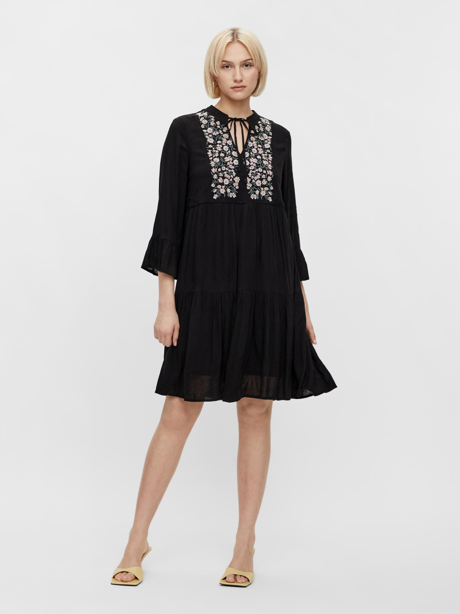 Model: Leia Farba: čierna Vzor: kvetovaný Strih: áčkový, voľný Dĺžka: krátka Rukáv: trojštvrťové Udržiteľnosť: ekologický materiál Materiál: 100% viskóza LENZING™ ECOVERO™