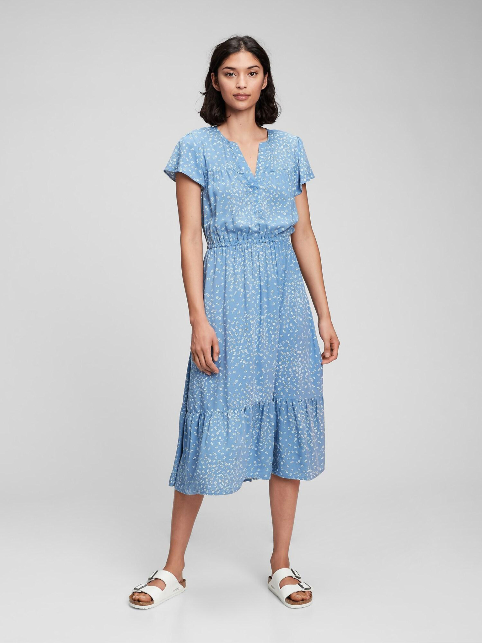 Materiál: 100 % viskóza Dĺžka: midi Strih: áčkový Typ: casual Vzor: vzorovaný Výstrih: do V Spodnička: nie Rukáv: krátky Pranie: 30 °C Farba: modrá
