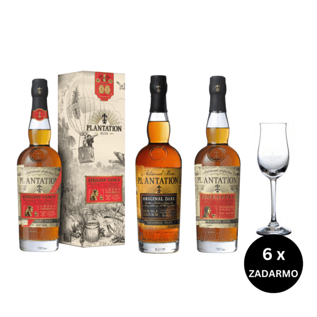 Tento balíček obsahuje fľašu Plantation Original Dark Plantation, ktorý bol zamatovo zjemnený ovocným ananásovým sirupom z čerstvých ananásov a Stiggins‘ Fancy Smoky Formula pridaním názovkomórne vysušených sliviek a dymového whisky. Okrem toho, dostanete aj 6 pohárov zdarma.