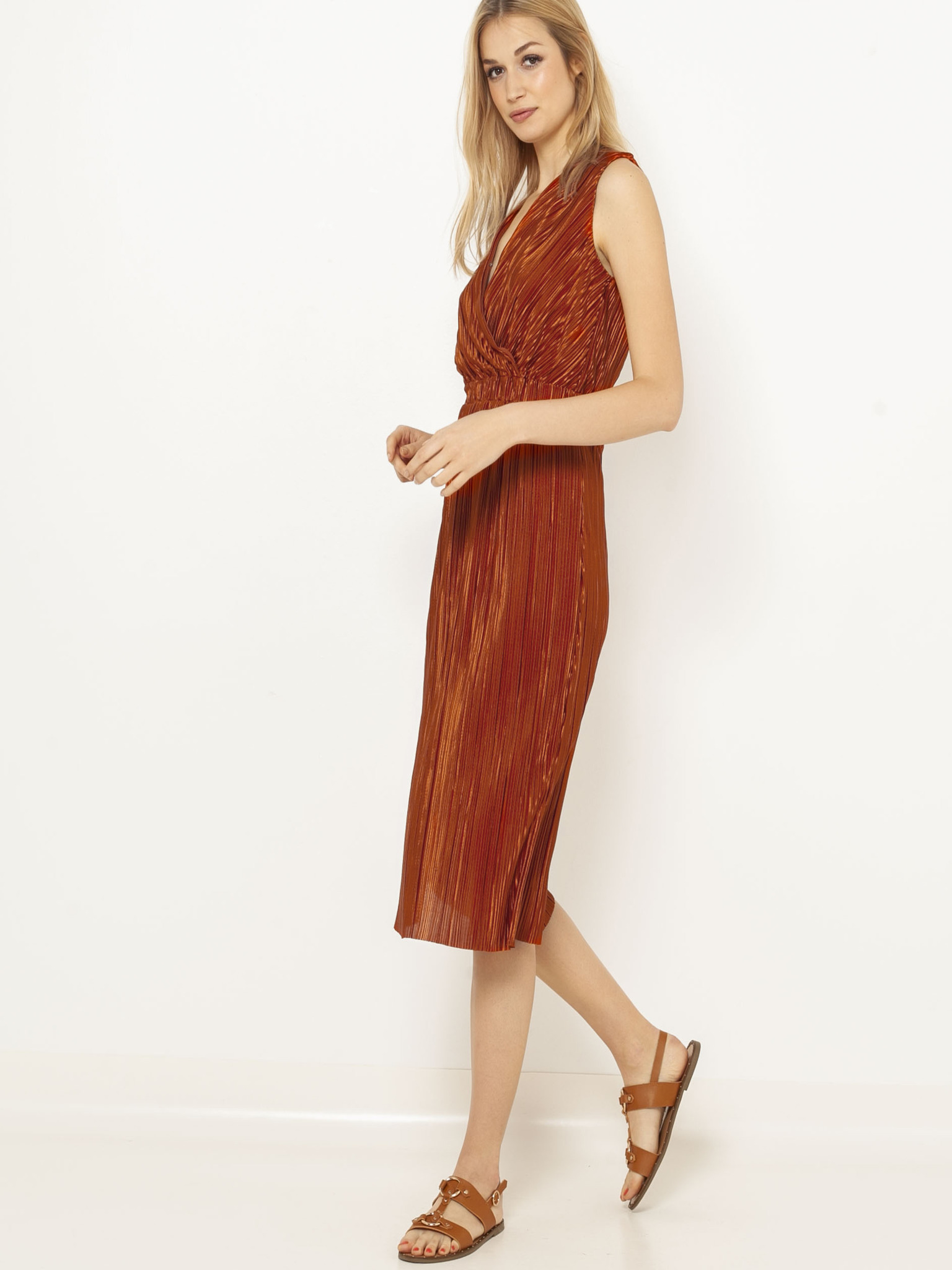 Farba: tehlová Strih: rovný Dĺžka: ku kolenám Výstrih: véčkový, prekladaný Materál: 100 % polyester