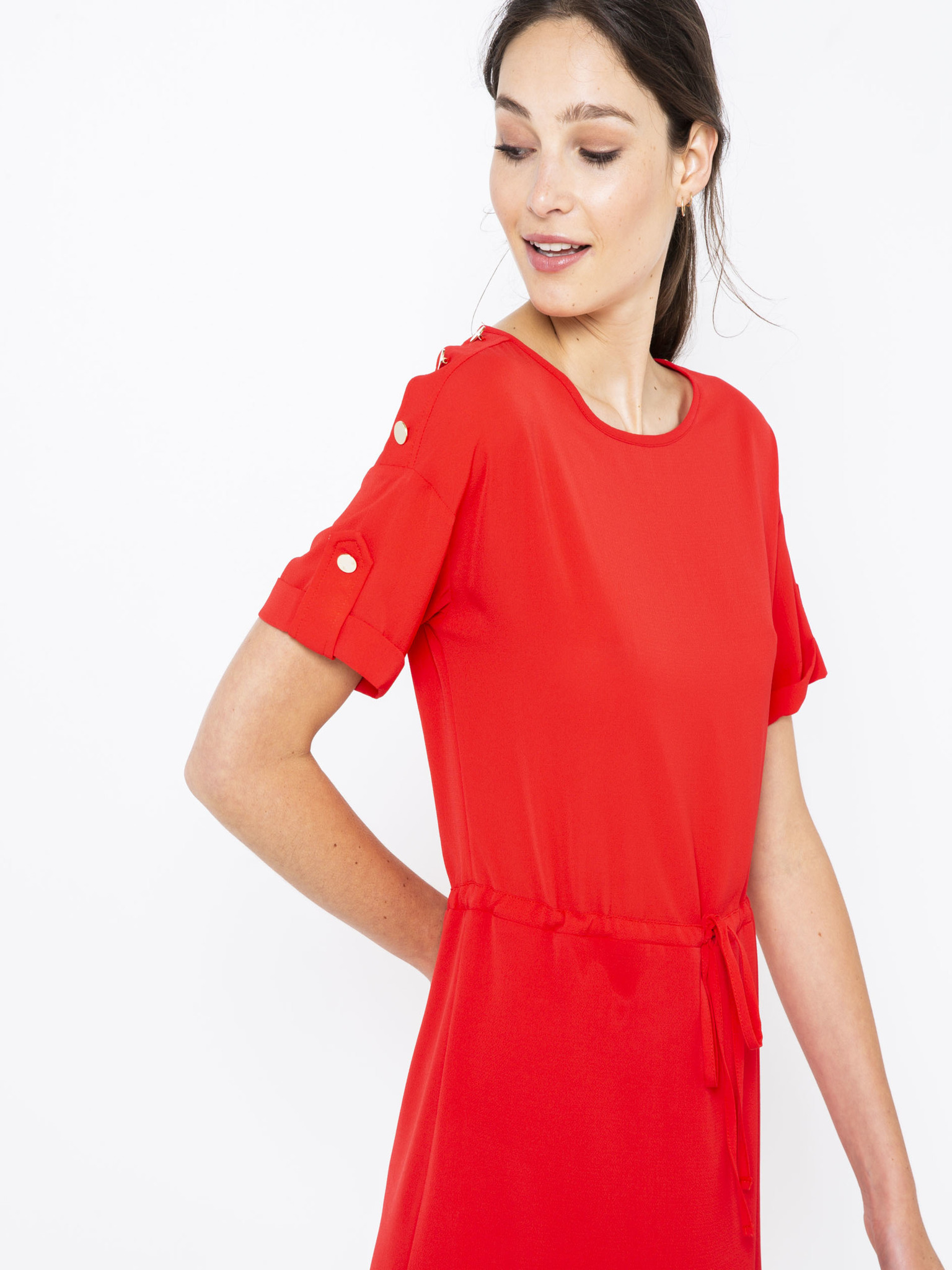 Farba: červená Dĺžka: krátka Strih: áčkový Výstrih: okrúhly Zapínanie: na zaväzovanie Materál: 100 % polyester
