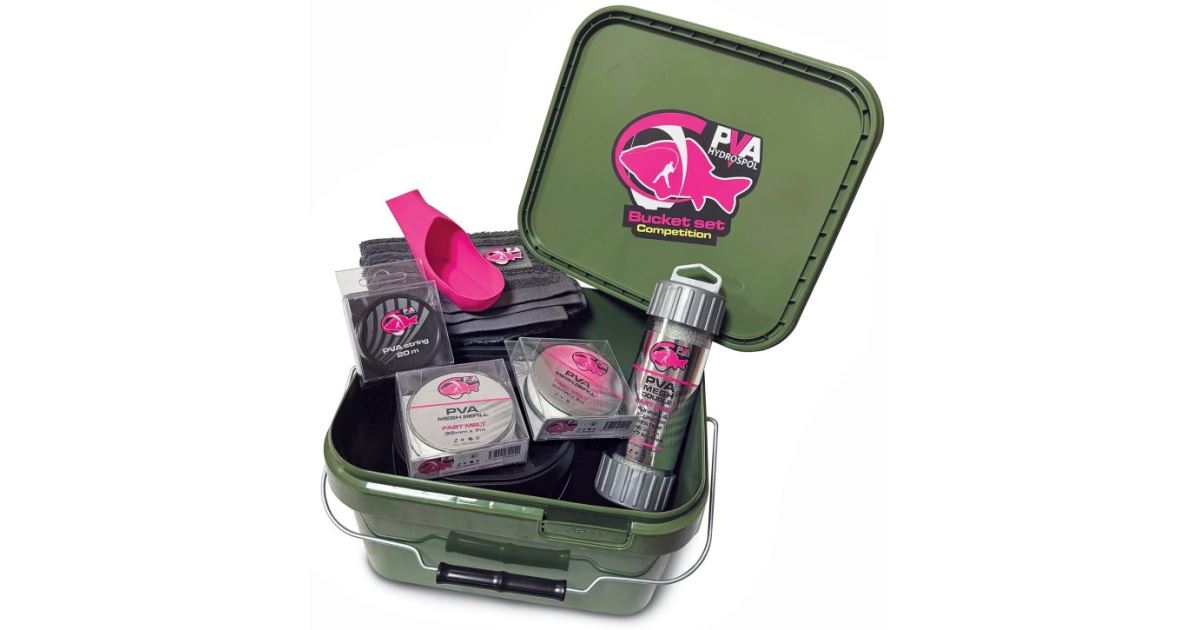 Toto vedro je nabité rýchlorozpustnou verziou PVA materiálov. Tá je vhodná pre závody, krátke vychádzky alebo chladnejšie mesiace, kedy rybár potrebuje okamžitú účinnosť. Vnútri vedra sa nachádza PVA mesh systém fast melt 2v1, ten ponúka spletený rýchlorozpustný micro mesh s priemerom 25 mm alebo 35 mm, oboje v 7 m návine. Vo vedre nájdete aj 2x náhradnú pančuchu, vždy jednu od priemeru. Posledný PVA produkt je pevná štvoržilková niť v návine 20 m, práve táto klasická „STRING“ je zhotovená z rýchlorozpustných vlákien. Bucket set Competition ďalej obsahuje lopatku na naberanie nástrah, praktickú uzatvárateľnú dózu na hotový PVA materiál a uterák s logom PVA Hydrospol.
